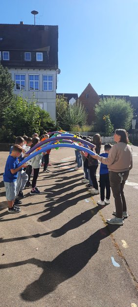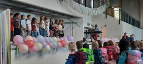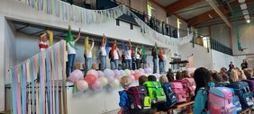 Nachdem dann alle Erstklasskinder namentlich auf die Bühne gerufen worden waren, ging es im Bus zur Schule, wo die Zweit- und Drittklässler die „Neuen“ mit einem Spalier auf dem Schulhof empfingen. Jetzt noch die erste Schulstunde – eine aufregende Sache - und der Vormittag war geschafft. Kurz nach 12 Uhr konnten die Eltern ihre stolzen Schulkinder wieder abholden und danach weiterfeiern.